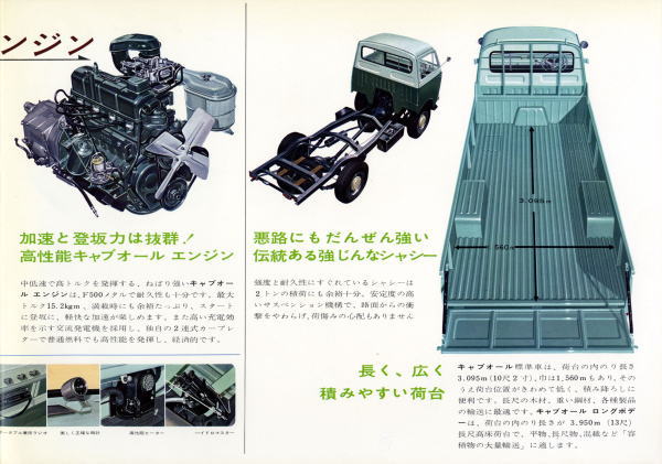 さて、この現在一般的なキャブオーバー型という形、最初は1955年にプリンス自動車(当時は富士精密工業)が「画期的なアンダーシート・エンジン・システム」として誕生させたものです。エンジンの上に運転席を配置することで、車体の全長を変えずに荷室スペースが拡大できるというメリットがありました。ジュニアは全長4660mmで荷台長が2310mm、キャブオールは全長4610mmで荷台長3095mmですから、かなりの差がありますね。
