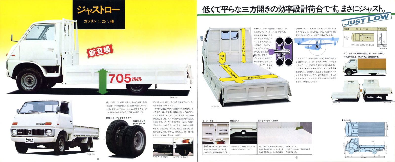 1971年にトヨタから発売された3代目トヨエース(PY/RY/JY型)です。3代目トヨエースは1979年まで生産され、このカタログは1977年のものですから、3代目とはいってもかなり熟成が進んだ時点でのカタログです。