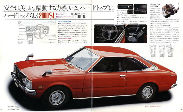 1973年にトヨタから発売された5代目コロナ(RT104/114/102/112/TT100/110型)です。カタログ中のコピーにもあるように「クルマ本来の姿をめざした安全の造型。いま、セダンはセダンらしく」きわめてオーソドックスで面白みのないスタイルをしています。この5代目コロナを形状そのままで少し大きくすると翌年発売される5代目クラウン(MS80系)になります。