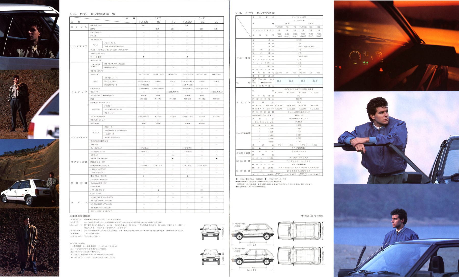 1983年にダイハツから発売された2代目シャレード(G11/G30型)です。このカタログはディーゼル専用のものなので、掲載されているモデルはG30型のみです。この代のシャレードには、イタリアのデ・トマゾがエアロチューンを施した“シャレード・デ・トマゾ・ターボ”という、なんとも個性的で印象深いモデルもありましたね。
