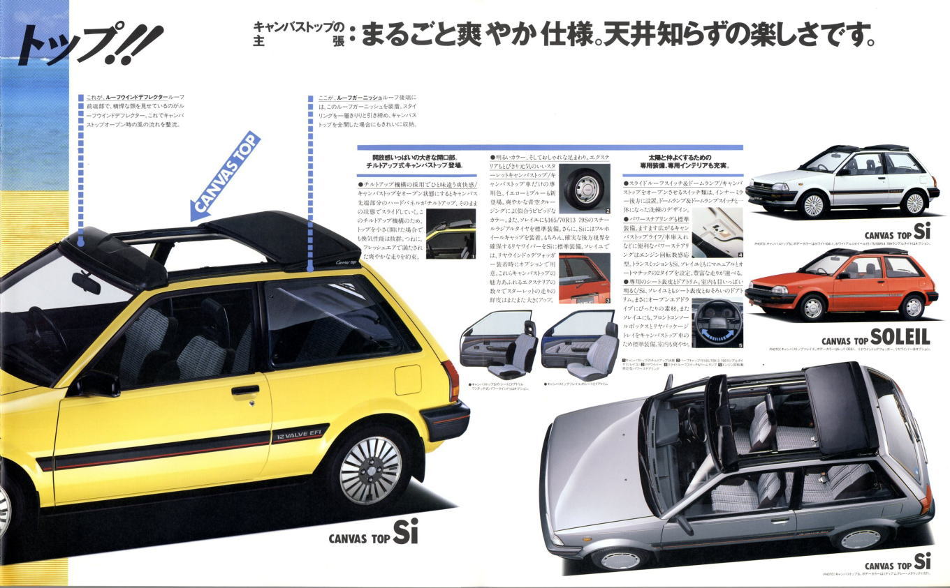 さて、3代目スターレット、このカタログはモデル末期のものなので“辛口ターボ”というキャッチフレーズが記載されていますが、その言葉通り、本当に辛口なクルマでした。こういう“辛口”(じゃじゃ馬的?)が好きな方にはたまらないクルマなんでしょうが、個人的にはこのクルマは“中辛”ぐらいがちょうど良いのではないかと思っていました。まあそう考える方はノンターボのグレードを選べば良いだけですから、辛口も中辛も甘口も用意してくれていた当時のトヨタはある意味、とても良心的でしたね。